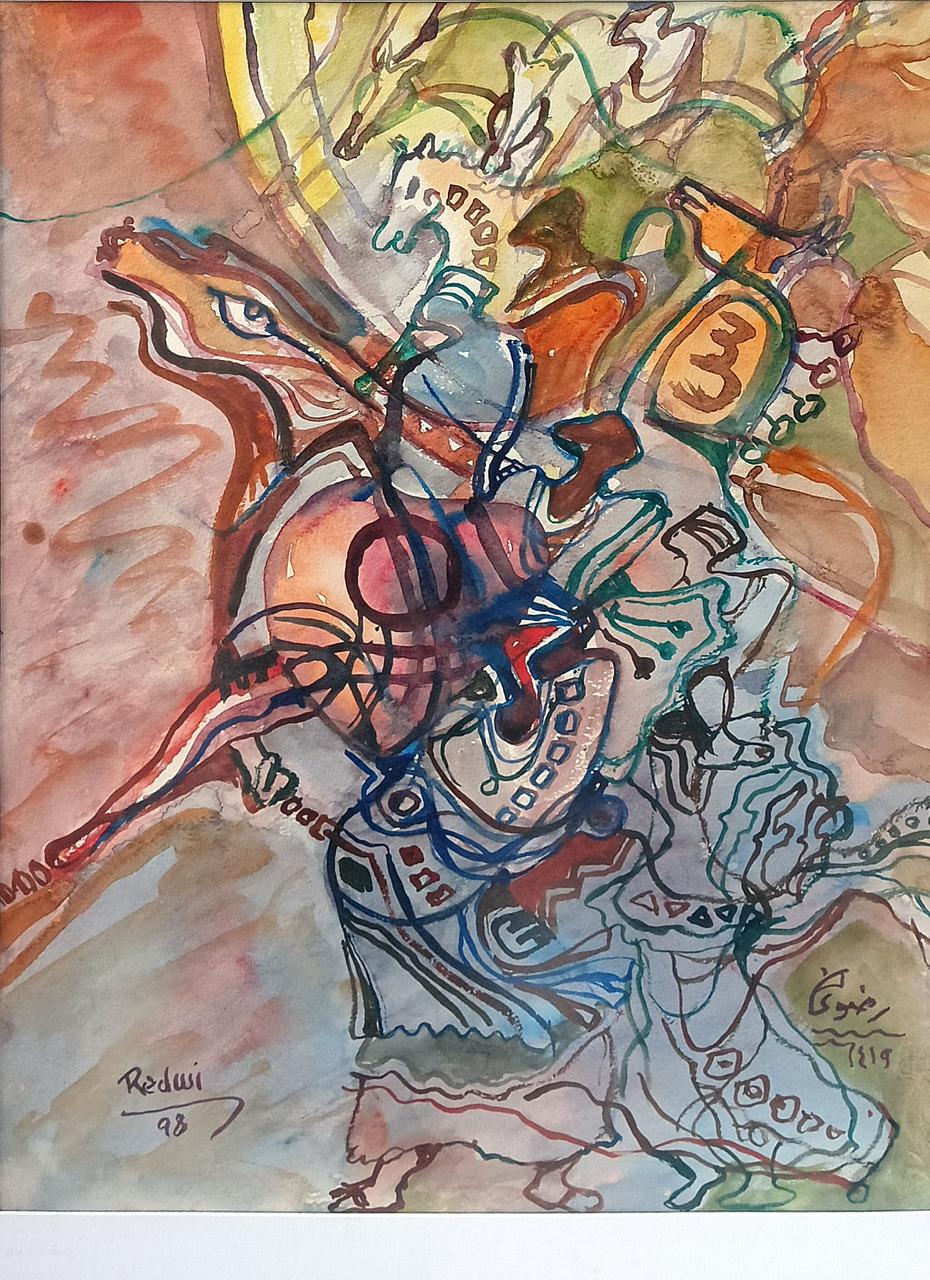 في أعماله التي مثلت مرحلة ثانية في تجربته الفنية وقد برزت الدائرة، انطلق رضوي من مفردة الحصان الذي ربما رأى فيه عنصرا يرمز للأصالة فنوع على حركته منطلقا من نقطة في الوسط ومنتهيا إلى أطراف العمل بحركة لولبية رأى فيها دينامية الحياة إلا أن عناصره التالية أخذت في التنوع وظهر في لوحته المنزل والأشخاص والحركة اليومية الشعبية، ومع التواصل في هذا التوجه أخذت الحركة تقل وتتوارى لصالح وضوح العناصر الجديدة التي أخذت تؤكد اتجاهه الفني الذي حافظ عليه إلى آخر أعماله المعروفة.