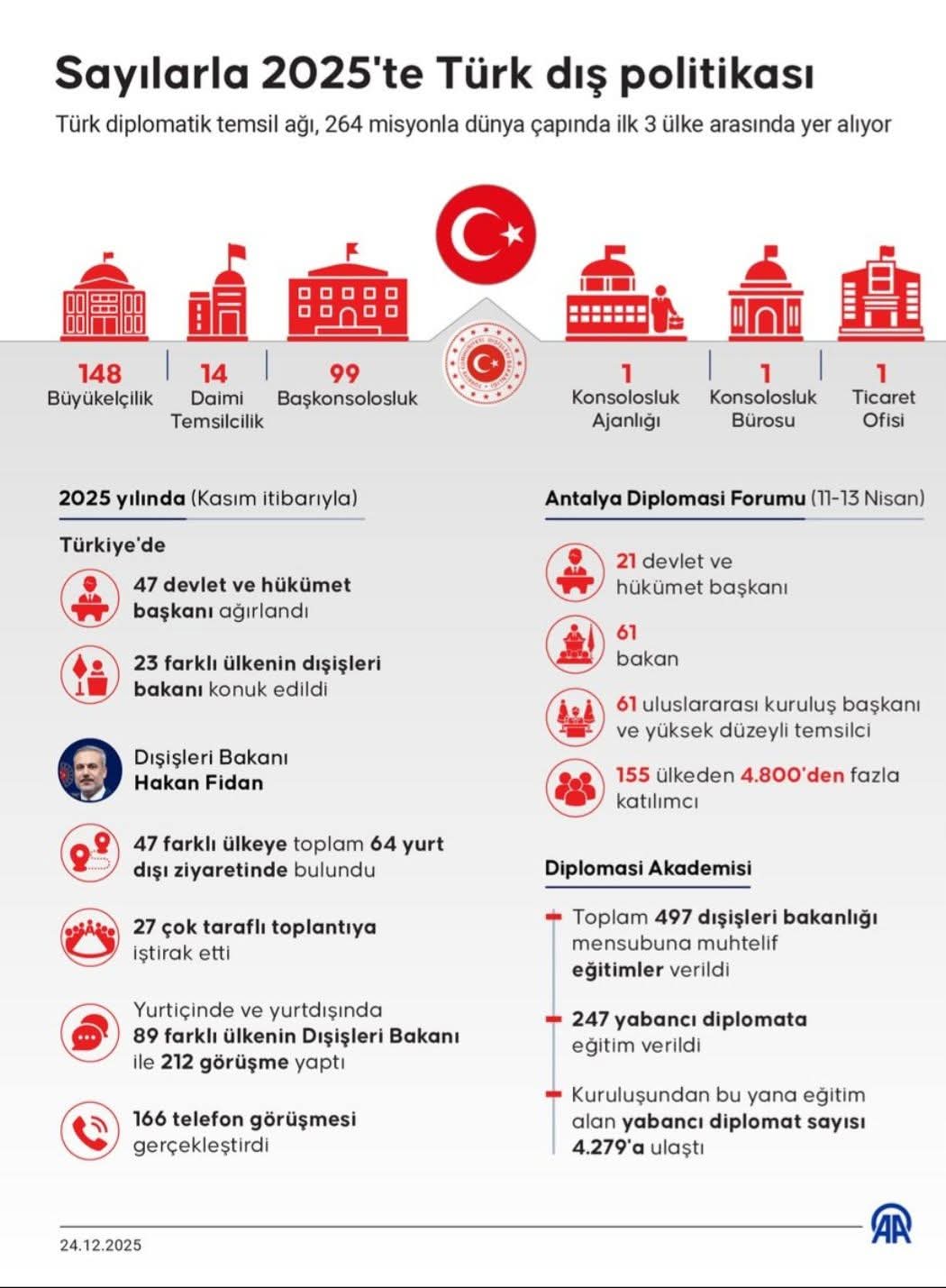 وتؤكد هذه الأرقام أن السياسة الخارجية التركية في 2025 لم تعتمد على الخطاب وحده، بل على شبكة علاقات واسعة، وحضور فعّال، وقدرة متزايدة على لعب دور محوري في القضايا الإقليمية والدولية.